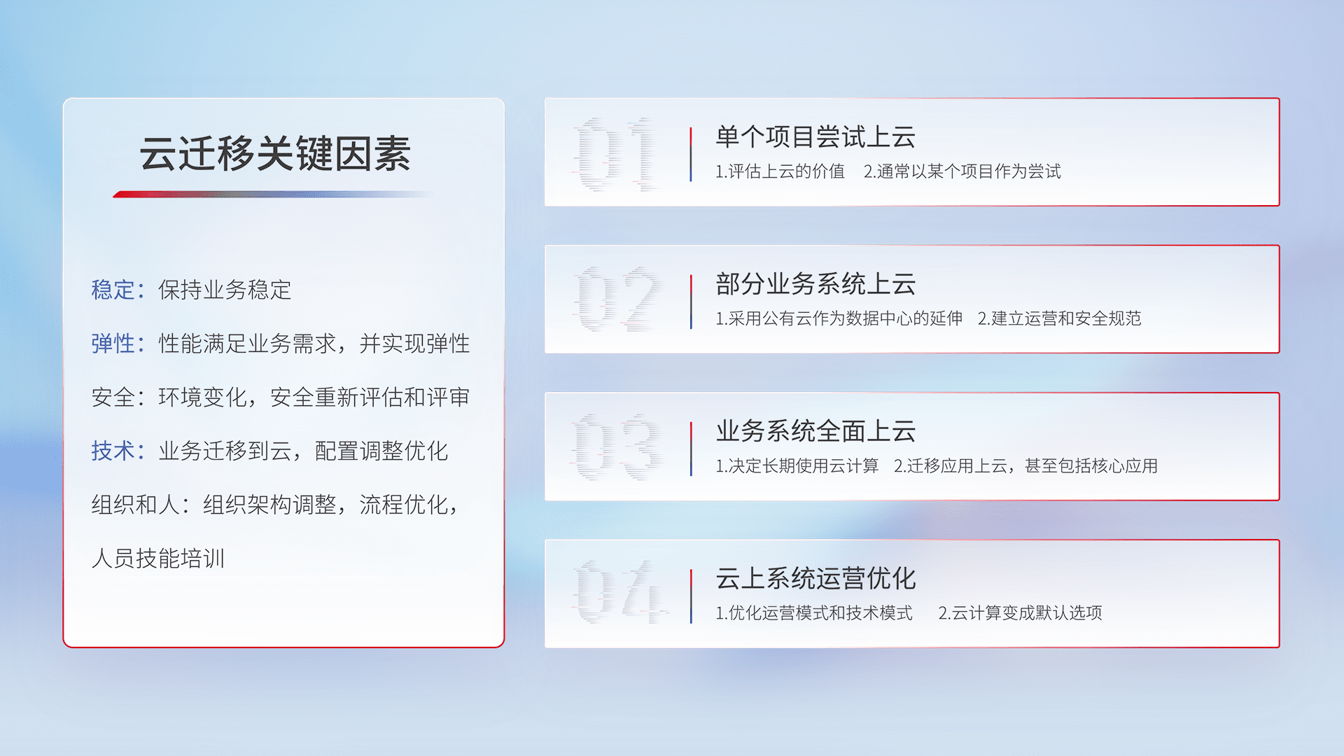 结合实际业务,,,从规划设计、、云平台选型、、云原生改造、、、数据迁移、、集成交付,,迁移全过程为客户识别最佳上云路径,,,,做好风险识别管理,,,设计网络架构、、、身份权限、、、、安全审计合规、、、、操作审计、、、日志审计、、监控告警策略、、多站点容灾设计等,,,对云上基础设施进行整体规划,,,提升IT治理水平,,以满足弹性、、、、高可用、、、高性能的需求。。